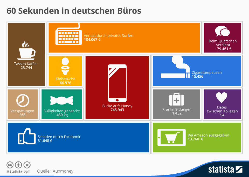 Demnach sind Erwerbstätige neben ihrer eigentlichen Beschäftigung allerlei Ablenkungen ausgesetzt. Zum Beispiel kaufen sie in 60 Sekunden für 13.760 Euro bei Amazon ein, gucken 745.943 Mal auf ihr Telefon und vertilgen 489 Kilogramm Süßigkeiten.