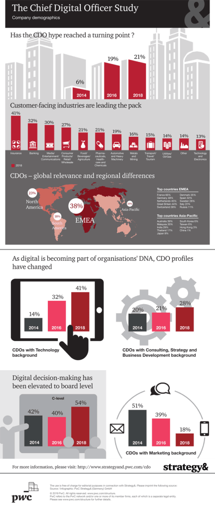 Zahlreiche Unternehmen weltweit haben die Verantwortung für die Digitalisierung in die Hände eines Chief Digital Officers (CDO) gelegt. Eine Studie der Unternehmensberatung Strategy& hat die 2.500 weltweit grössten börsennotierten Unternehmen untersucht.